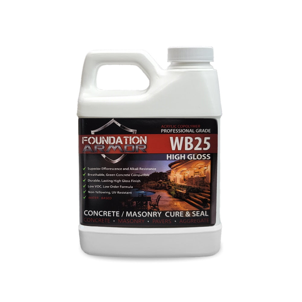 Armor WB25: The Armor WB25 is a high gloss sealer designed to slightly enhance the color of the substrate and provide an attractive high gloss finish. The Armor WB25 is designed specifically for unsealed concrete and concrete pavers, and concrete and concrete pavers previously sealed with a water-based acrylic sealer.