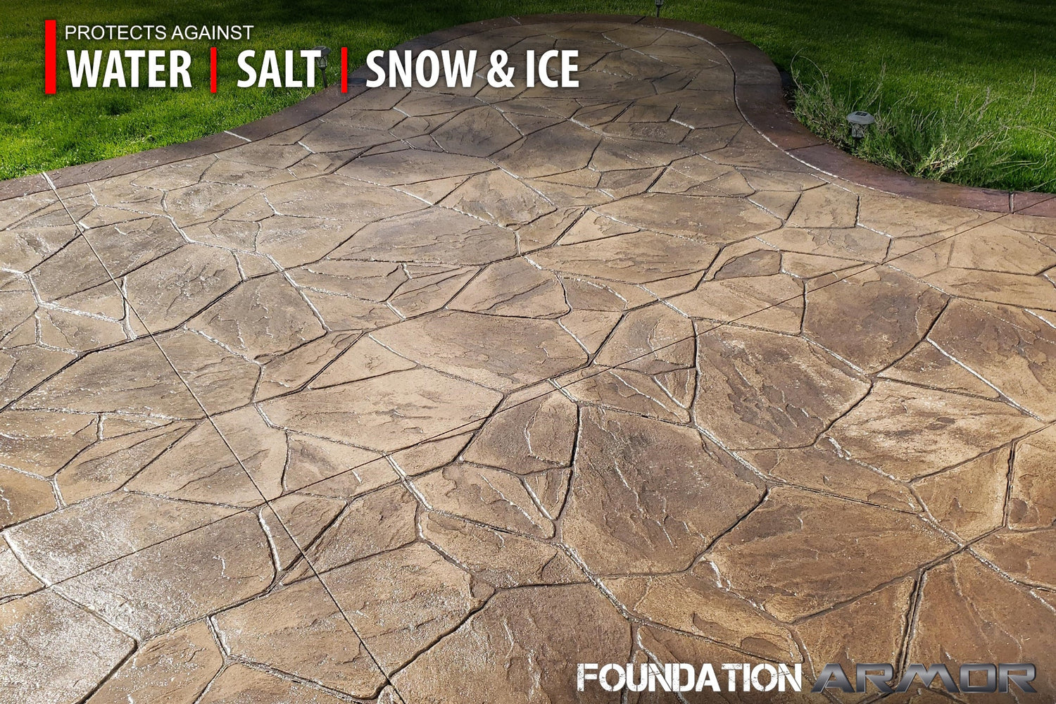 It can be applied to unsealed stamped concrete, brick, pavers, and natural stone. It works entirely below the surface and won't leave behind a visible surface film or coating.